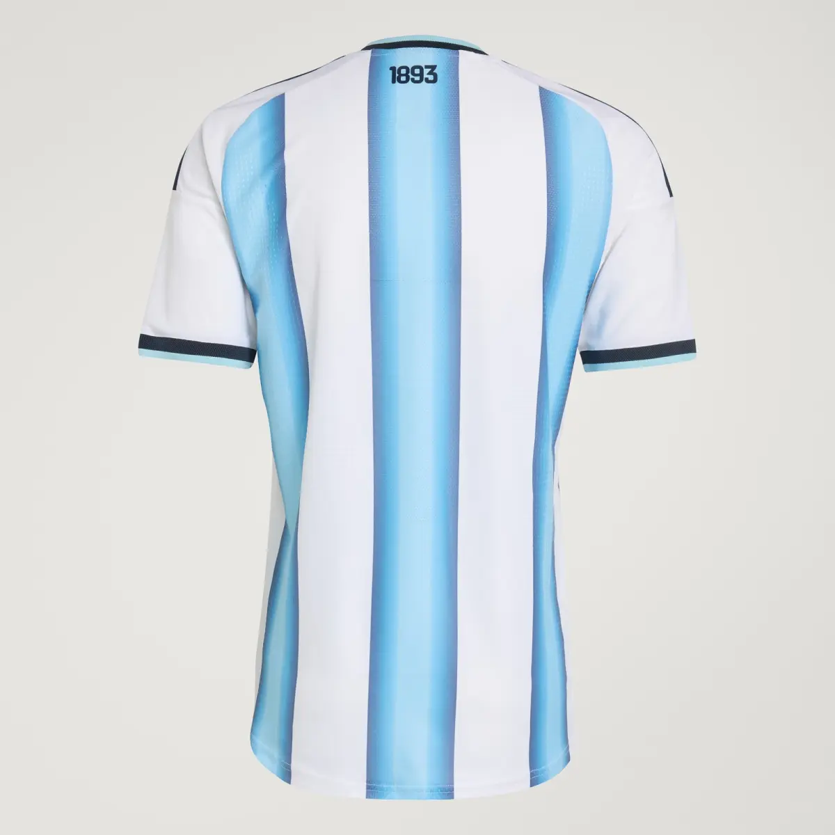 Inspirada en los tonos de azul presentes en sus tres victorias mundialistas, la nueva Camiseta Titular de Argentina para la Copa Mundial de la FIFA 26™ une esos colores en un diseño en degradé. La tercera estrella sobre el escudo rinde homenaje a una nación de campeones y cada detalle celebra el legado del fútbol argentino.